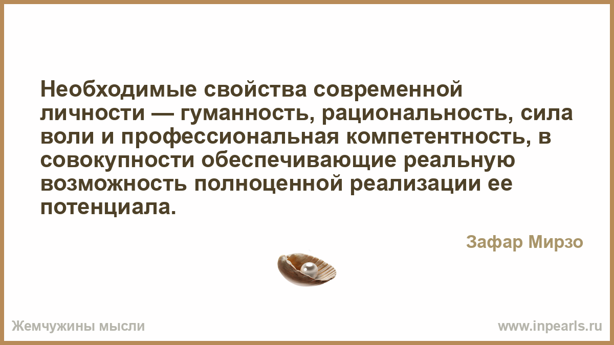 Необходимые свойства современной личности — гуманность, рациональность, сила воли и профессиональная компетентность, в совокупности обеспечивающие реальную возможность полноценной реализации ее потенциала.