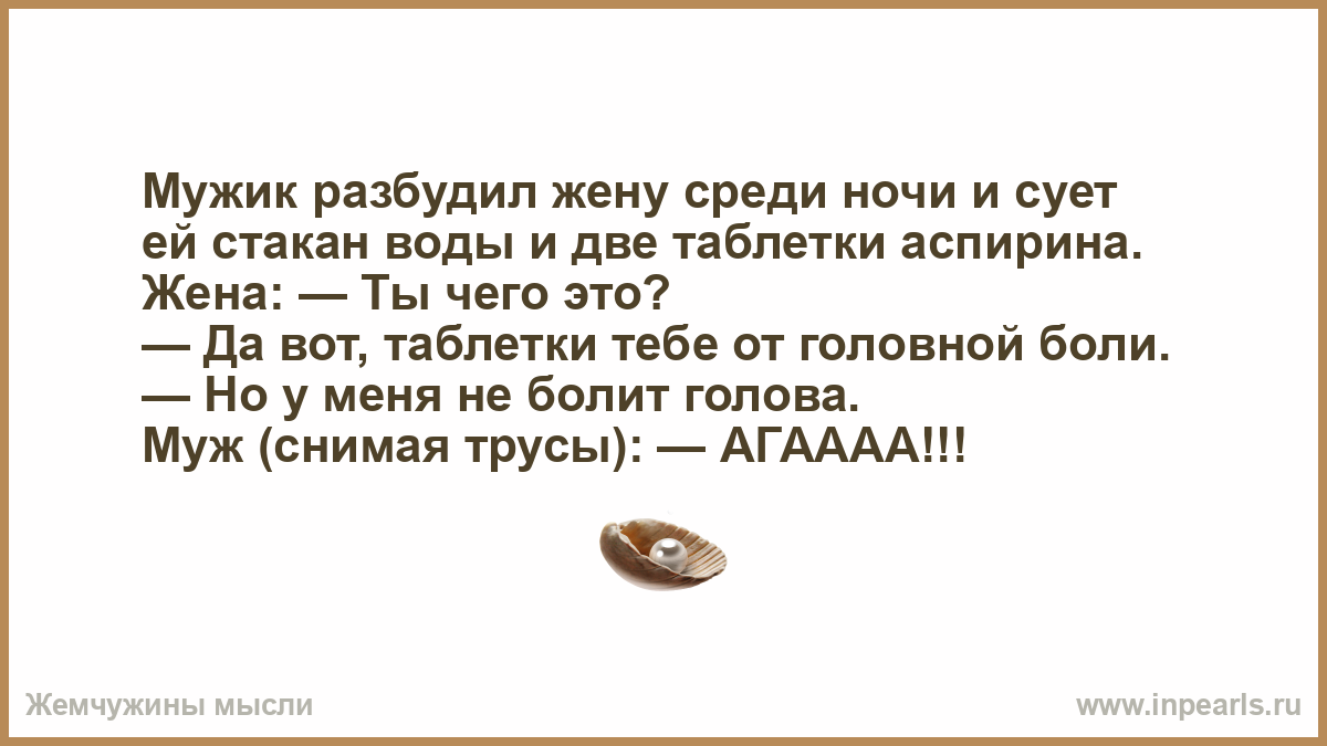 Мужик разбудил жену среди ночи и сует ей стакан воды и две таблетки аспирина. Жена: — Ты чего это? — Да вот, таблетки тебе от головной боли. — Но у меня не болит голова. Муж (снимая трусы): — АГАААА!!!