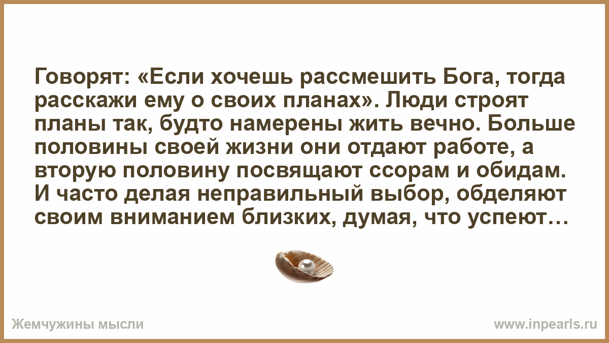 Говорят: «Если хочешь рассмешить Бога, тогда расскажи ему о своих планах». Люди строят планы так, будто намерены жить вечно. Больше половины своей жизни они отдают работе, а вторую половину посвящают ссорам и обидам. И часто делая неправильный выбор, обделяют своим вниманием близких, думая, что успеют сделать это позже, а пока надо делать карьеру. Но жизнь любит преподносить сюрпризы.