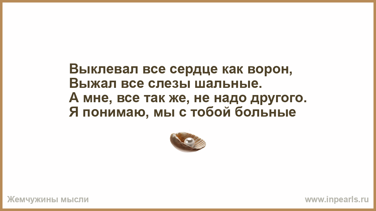 Выклевал все сердце как ворон, Выжал все слезы шальные. А мне, все так же, не надо другого. Я понимаю, мы с тобой больные