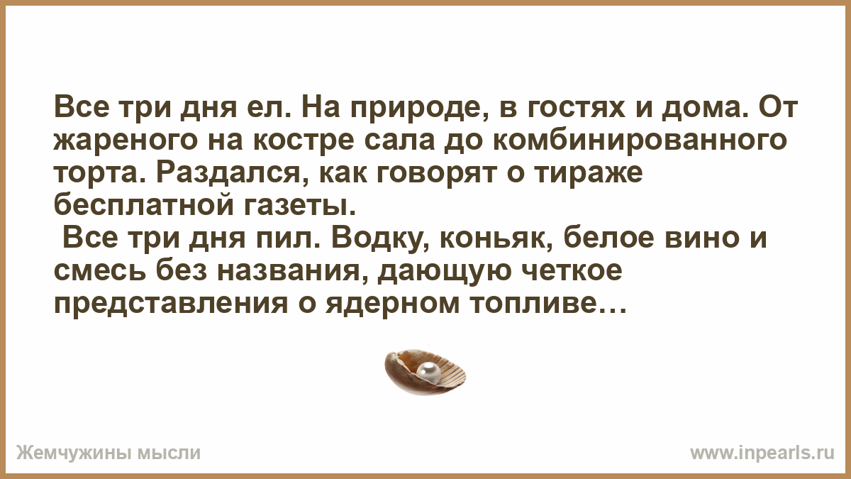 Все три дня пил. Водку, коньяк, белое вино и смесь без названия, дающую четкое представления о ядерном топливе.