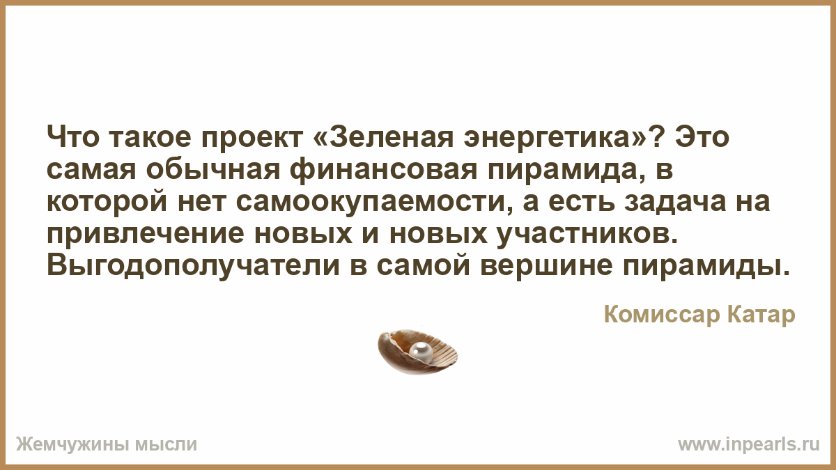 Что такое проект «Зеленая энергетика»? Это самая обычная финансовая пирамида, в которой нет самоокупаемости, а есть задача на привлечение новых и новых участников. Выгодополучатели в самой вершине пирамиды.