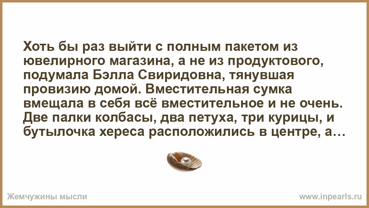 Хоть бы раз выйти с полным пакетом из ювелирного магазина, а не из продуктового, подумала Бэлла Свиридовна, тянувшая провизию домой. Вместительная сумка вмещала в себя всё вместительное и не очень. Две палки колбасы, два петуха, три курицы, и бутылочка хереса расположились в центре, а остальные харчи нарушив все понятия о приличии хаотично торчали, кто куда.