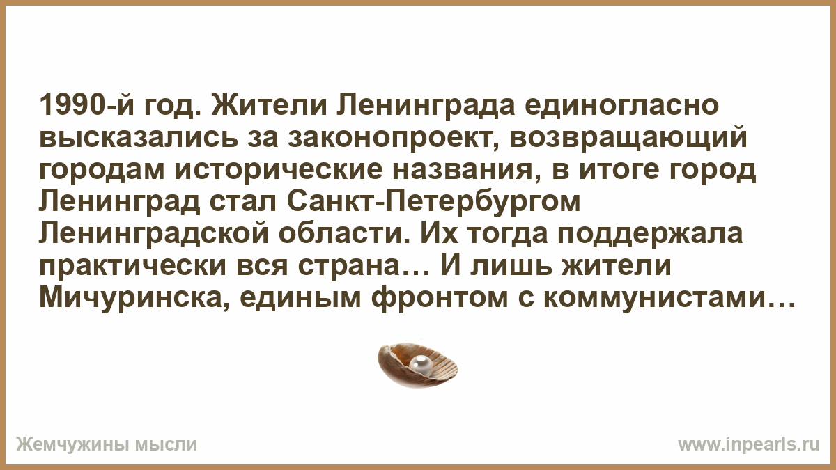 1990-й год. Жители Ленинграда единогласно высказались за законопроект, возвращающий городам исторические названия, в итоге город Ленинград стал Санкт-Петербургом Ленинградской области. Их тогда поддержала практически вся страна… И лишь жители Мичуринска, единым фронтом с коммунистами, до конца боролись против переименования… И до сих пор их город не переименован… А ведь могли восстановить такое красивое историческое название: «город Козлов».