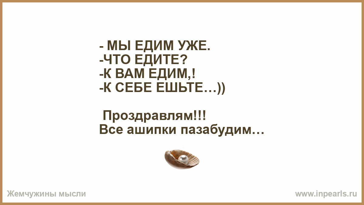 - МЫ ЕДИМ УЖЕ. -ЧТО ЕДИТЕ? -К ВАМ ЕДИМ,! -К СЕБЕ ЕШЬТЕ…))