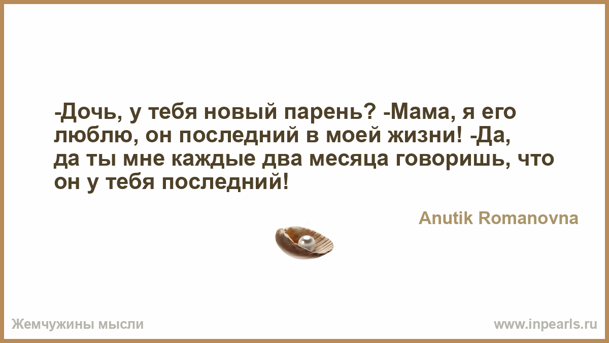 -Дочь, у тебя новый парень? -Мама, я его люблю, он последний в моей жизни! -Да, да ты мне каждые два месяца говоришь, что он у тебя последний!