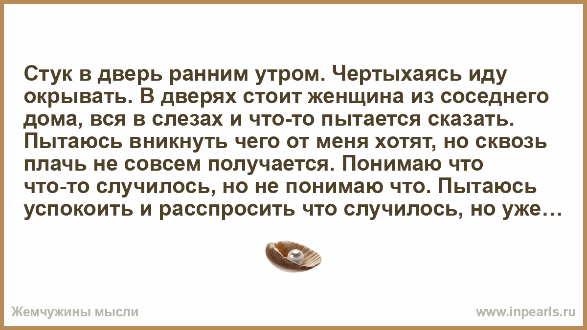 Стук в дверь ранним утром. Чертыхаясь иду окрывать. В дверях стоит женщина из соседнего дома, вся в слезах и что-то пытается сказать. Пытаюсь вникнуть чего от меня хотят, но сквозь плачь не совсем получается. Понимаю что что-то случилось, но не понимаю что. Пытаюсь успокоить и расспросить что случилось, но уже более спокойно. В ответ машет руками и зовет за собой.
