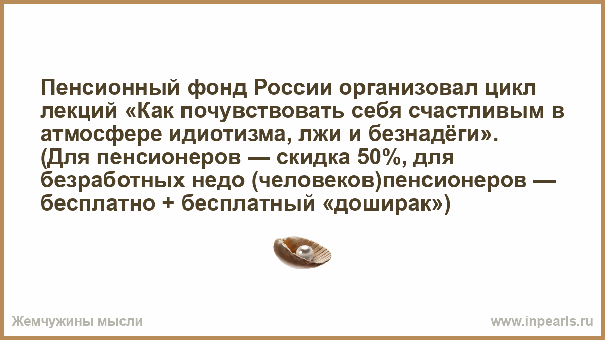 Пенсионный фонд России организовал цикл лекций «Как почувствовать себя счастливым в атмосфере идиотизма, лжи и безнадёги». (Для пенсионеров — скидка 50%, для безработных недо (человеков)пенсионеров — бесплатно + бесплатный «доширак»)
