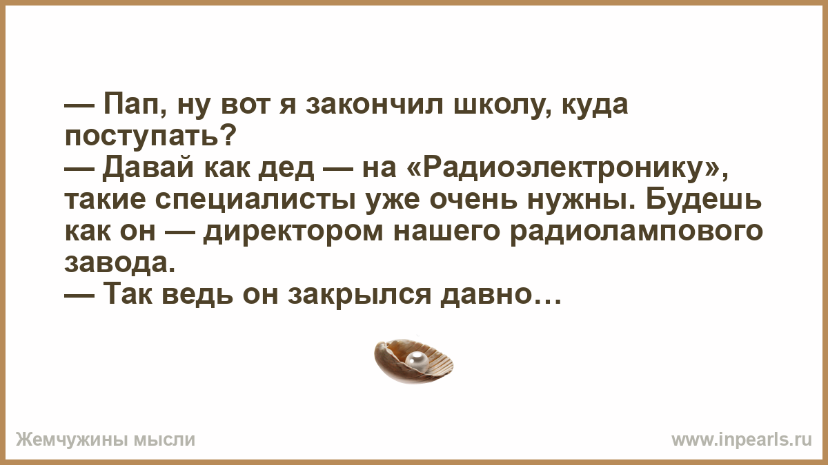 — Давай как дед — на «Радиоэлектронику», такие специалисты уже очень нужны. Будешь как он — директором нашего радиолампового завода.