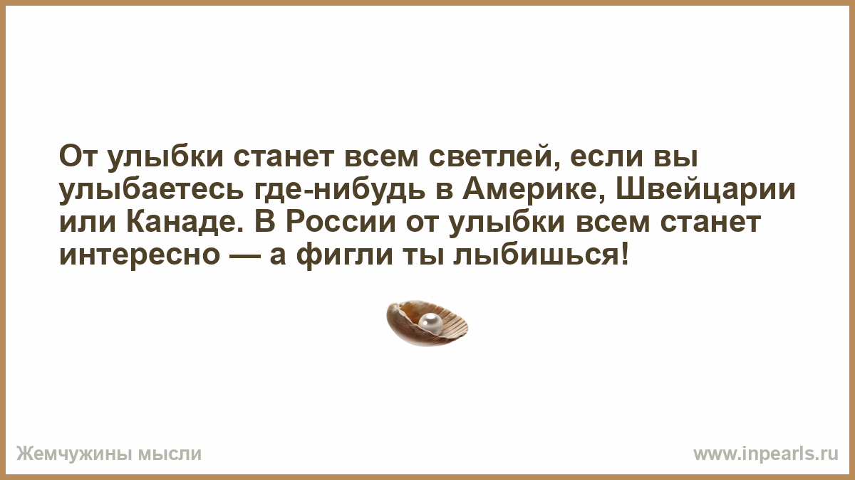 От улыбки станет всем светлей, если вы улыбаетесь где-нибудь в Америке, Швейцарии или Канаде. В России от улыбки всем станет интересно — а фигли ты лыбишься!