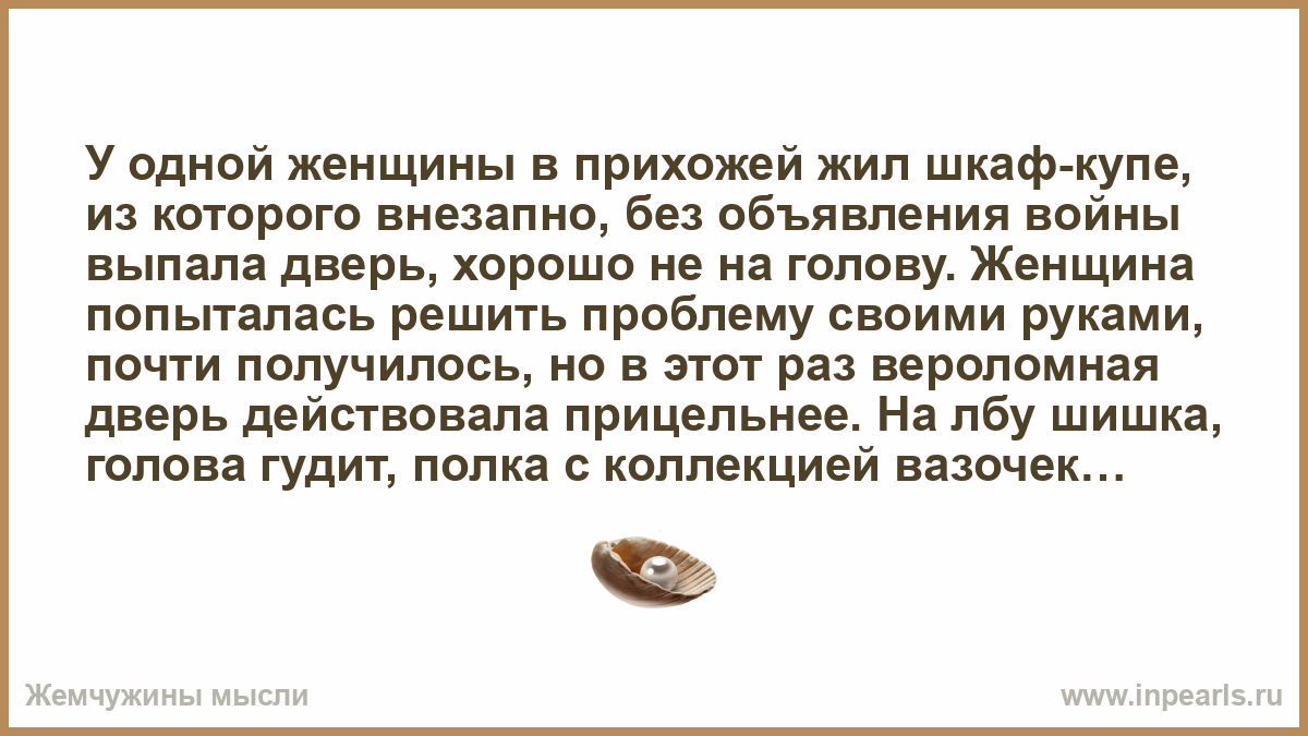У одной женщины в прихожей жил шкаф-купе, из которого внезапно, без объявления войны выпала дверь, хорошо не на голову. Женщина попыталась решить проблему своими руками, почти получилось, но в этот раз вероломная дверь действовала прицельнее. На лбу шишка, голова гудит, полка с коллекцией вазочек снесена, дверь самодовольно разлеглась поперёк коридора, и очень хочется повеситься.