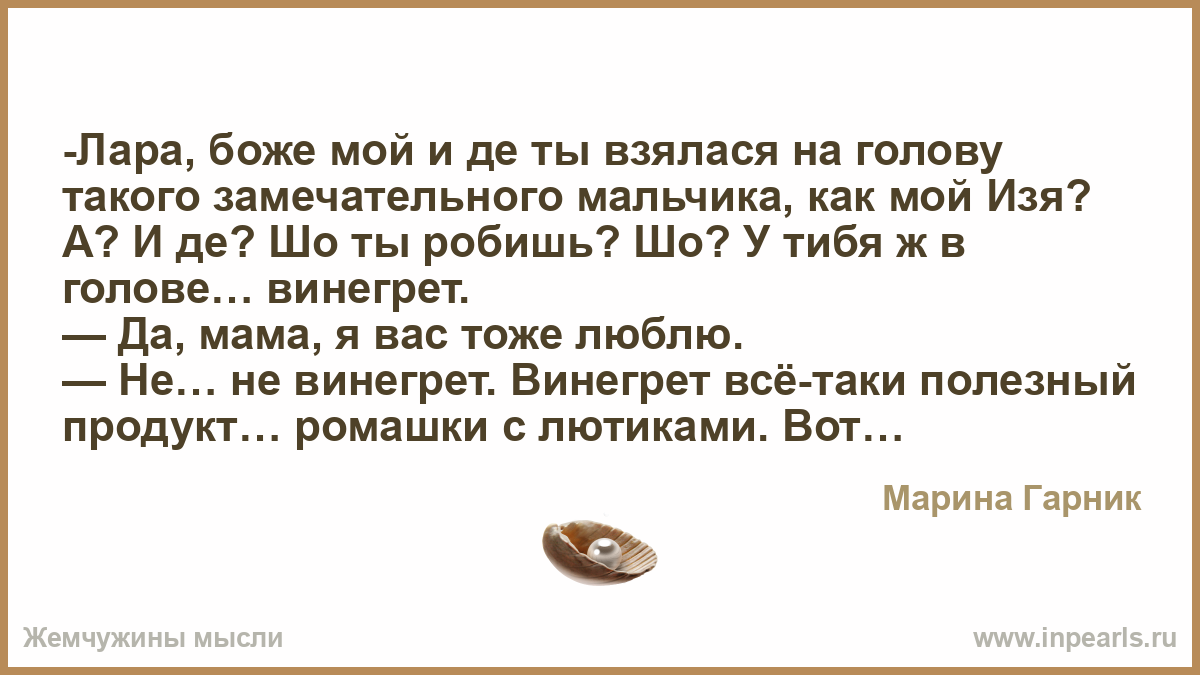 -Лара, боже мой и де ты взялася на голову такого замечательного мальчика, как мой Изя? А? И де? Шо ты робишь? Шо? У тибя ж в голове… винегрет.