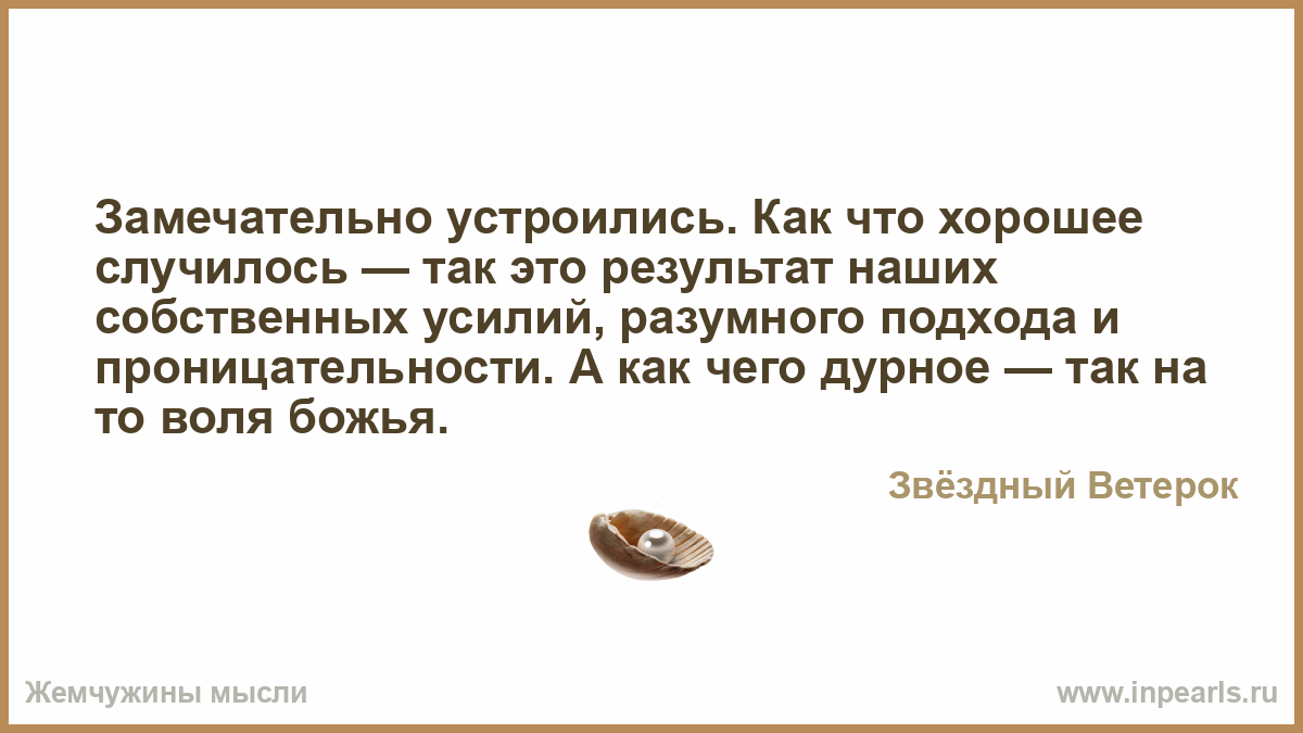 Замечательно устроились. Как что хорошее случилось — так это результат наших собственных усилий, разумного подхода и проницательности. А как чего дурное — так на то воля божья.