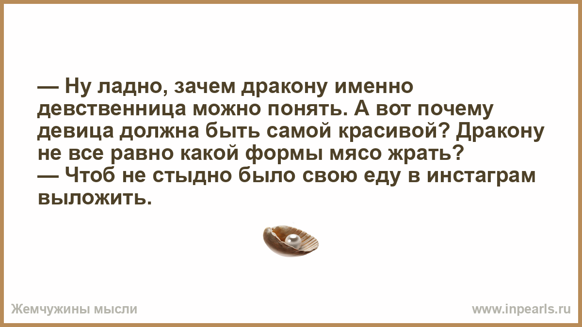 — Ну ладно, зачем дракону именно девственница можно понять. А вот почему девица должна быть самой красивой? Дракону не все равно какой формы мясо жрать? — Чтоб не стыдно было свою еду в инстаграм выложить.