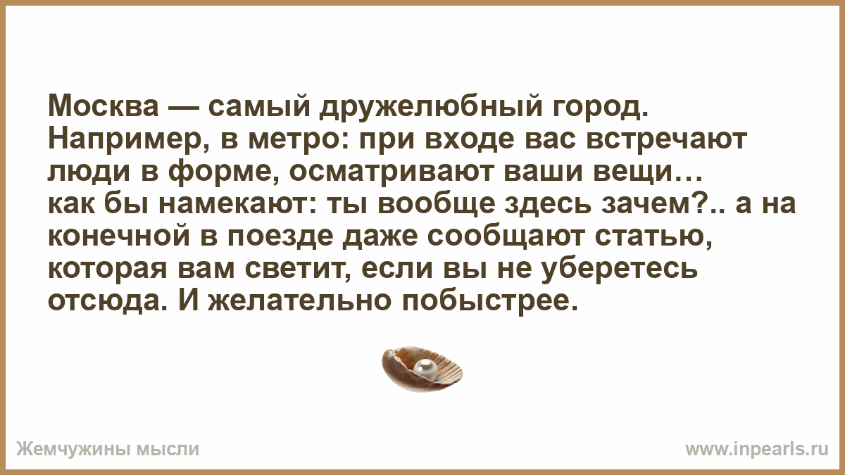 Москва — самый дружелюбный город. Например, в метро: при входе вас встречают люди в форме, осматривают ваши вещи… как бы намекают: ты вообще здесь зачем?.. а на конечной в поезде даже сообщают статью, которая вам светит, если вы не уберетесь отсюда. И желательно побыстрее.