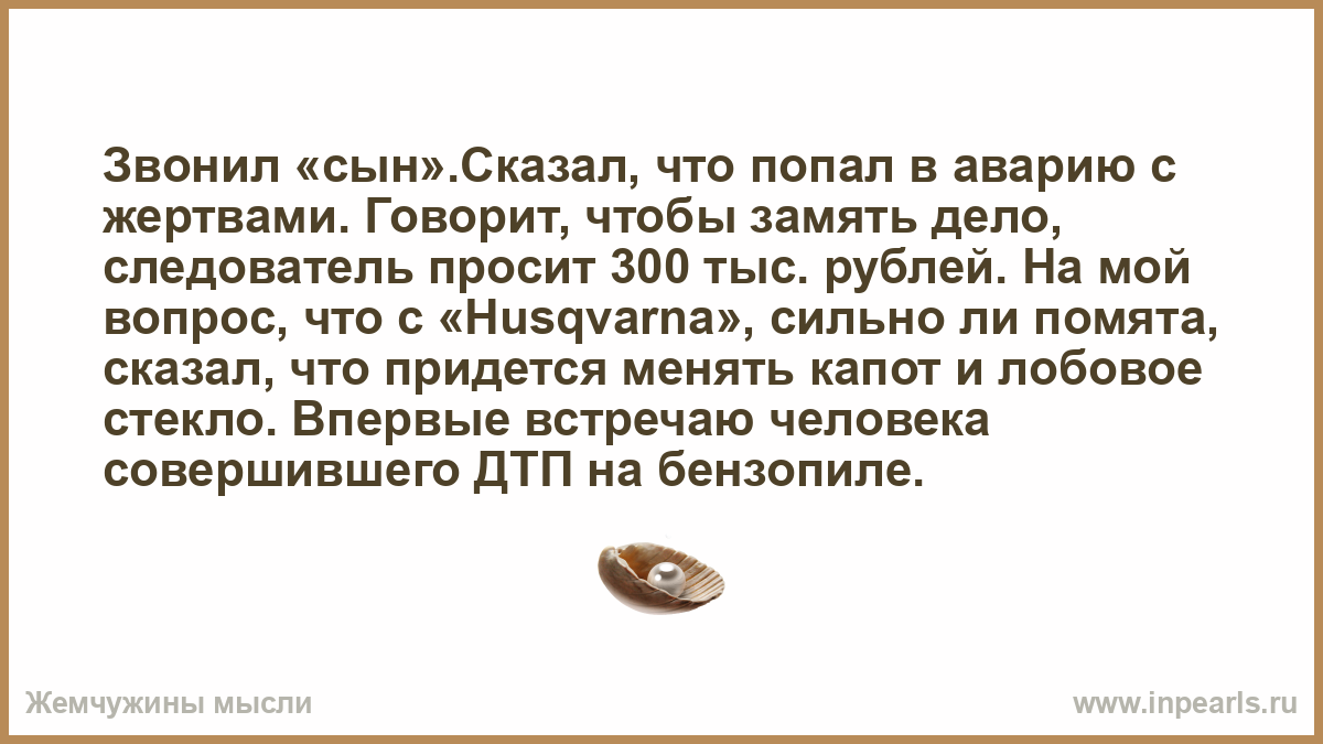 Звонил «сын».Сказал, что попал в аварию с жертвами. Говорит, чтобы замять дело, следователь просит 300 тыс. рублей. На мой вопрос, что с «Husqvarna», сильно ли помята, сказал, что придется менять капот и лобовое стекло. Впервые встречаю человека совершившего ДТП на бензопиле.