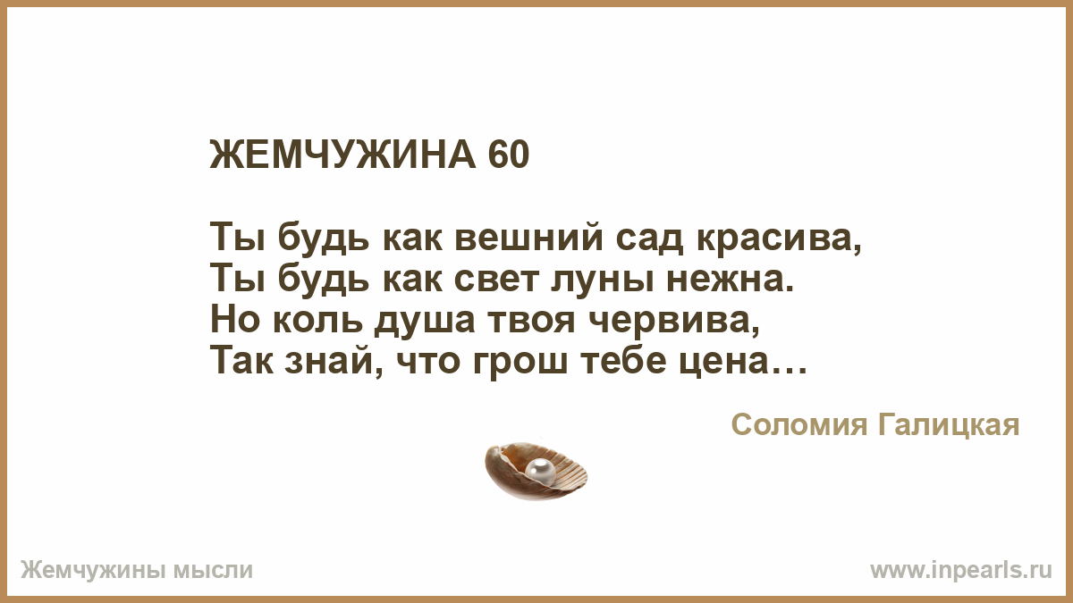 Ты будь как вешний сад красива, Ты будь как свет луны нежна. Но коль душа твоя червива, Так знай, что грош тебе цена.