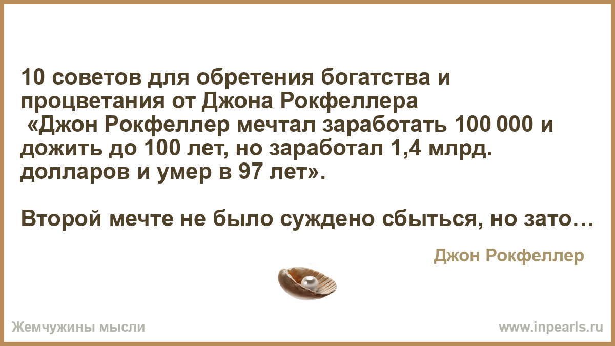 «Джон Рокфеллер мечтал заработать 100 000 и дожить до 100 лет, но заработал 1,4 млрд. долларов и умер в 97 лет».