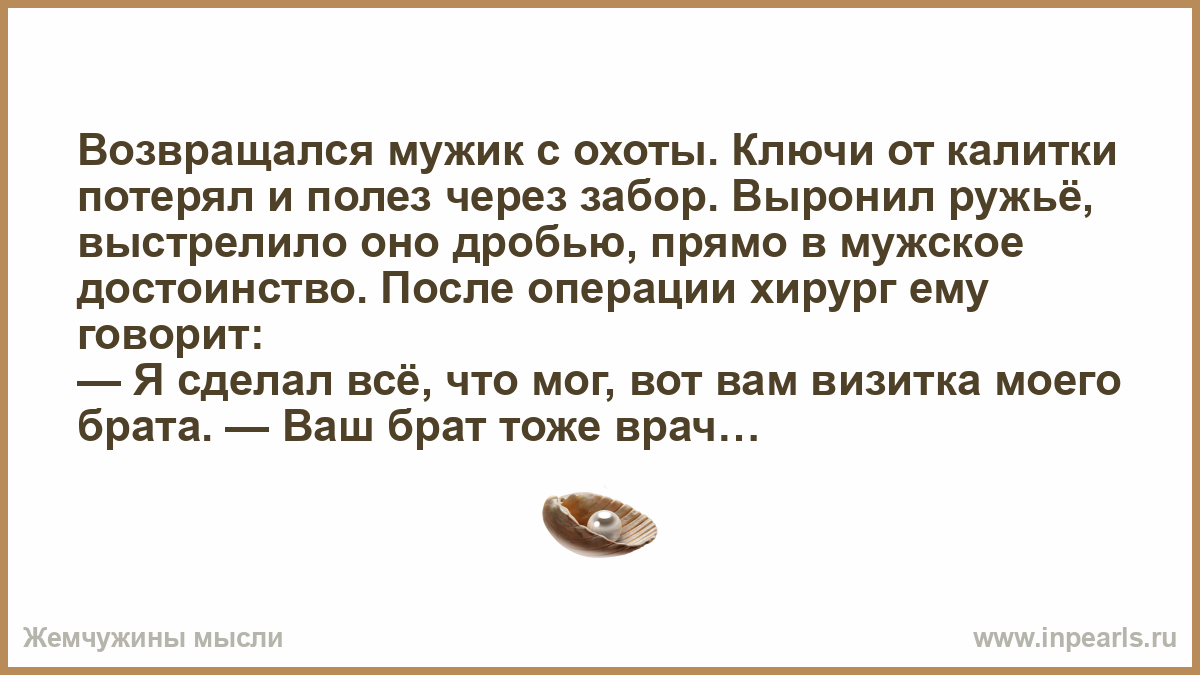 Возвращался мужик с охоты. Ключи от калитки потерял и полез через забор. Выронил ружьё, выстрелило оно дробью, прямо в мужское достоинство. После операции хирург ему говорит: