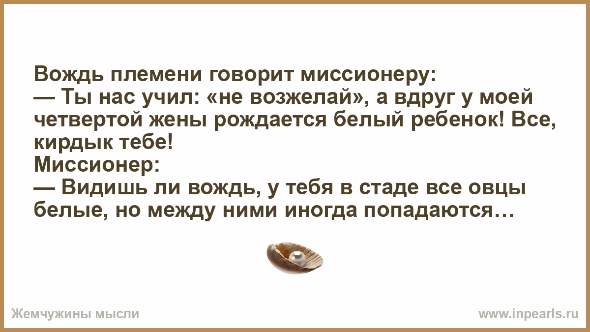 — Ты нас учил: «не возжелай», а вдруг у моей четвертой жены рождается белый ребенок! Все, кирдык тебе!