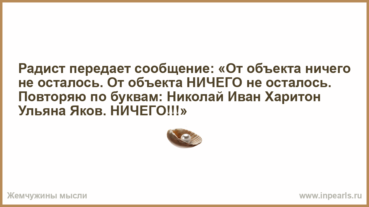 Радист передает сообщение: «От объекта ничего не осталось. От объекта НИЧЕГО не осталось. Повторяю по буквам: Николай Иван Харитон Ульяна Яков. НИЧЕГО!!!»