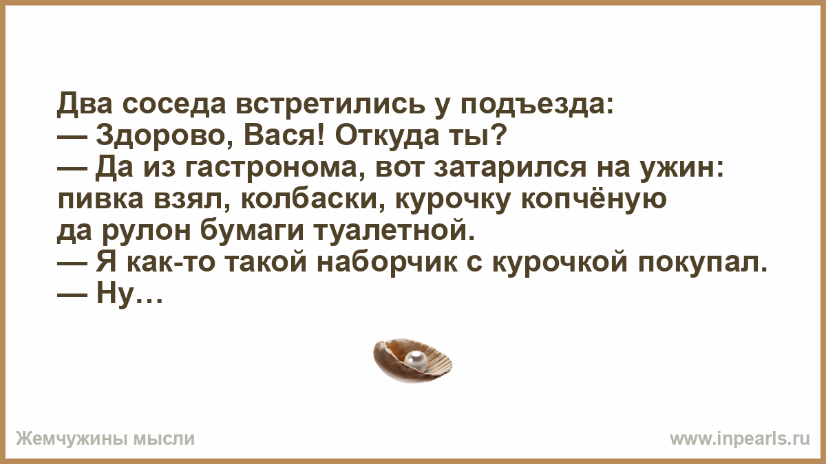 — Да из гастронома, вот затарился на ужин: пивка взял, колбаски, курочку копчёную да рулон бумаги туалетной.
