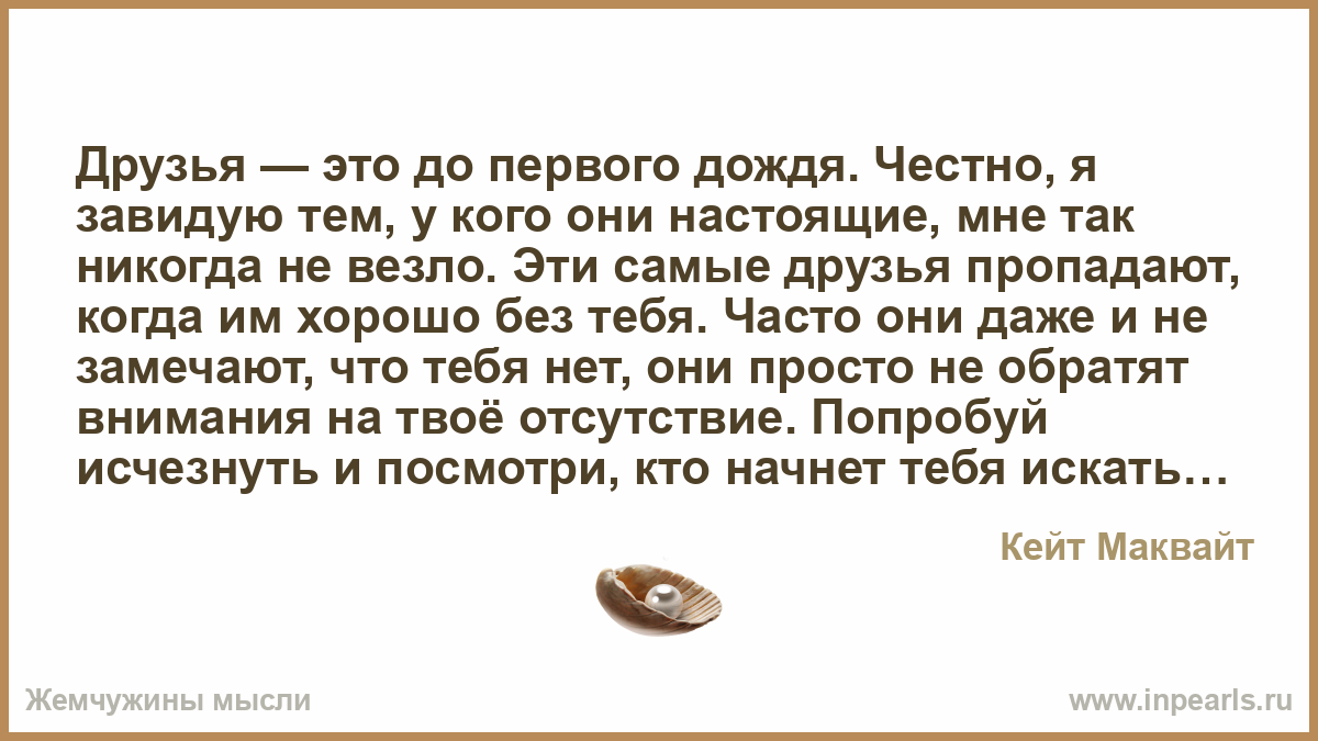 Друзья — это до первого дождя. Честно, я завидую тем, у кого они настоящие, мне так никогда не везло. Эти самые друзья пропадают, когда им хорошо без тебя. Часто они даже и не замечают, что тебя нет, они просто не обратят внимания на твоё отсутствие. Попробуй исчезнуть и посмотри, кто начнет тебя искать, кто действительно начнёт переживать, и кто вообще заметит пропажу… А праздники? Вот попробуй никого не поздравить, и ты увидишь, что никто и не позаботится сделать это первым. Попробуй не напоминать о себе, и тебя забудут. Убери дату рождения со своей странички в социальной сети, и тебя никто не поздравит… Таков наш мир. Но самое обидное, что это абсолютно нормально.
