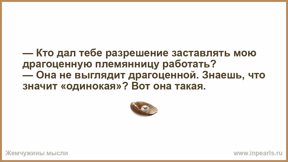 — Кто дал тебе разрешение заставлять мою драгоценную племянницу работать? — Она не выглядит драгоценной. Знаешь, что значит «одинокая»? Вот она такая.