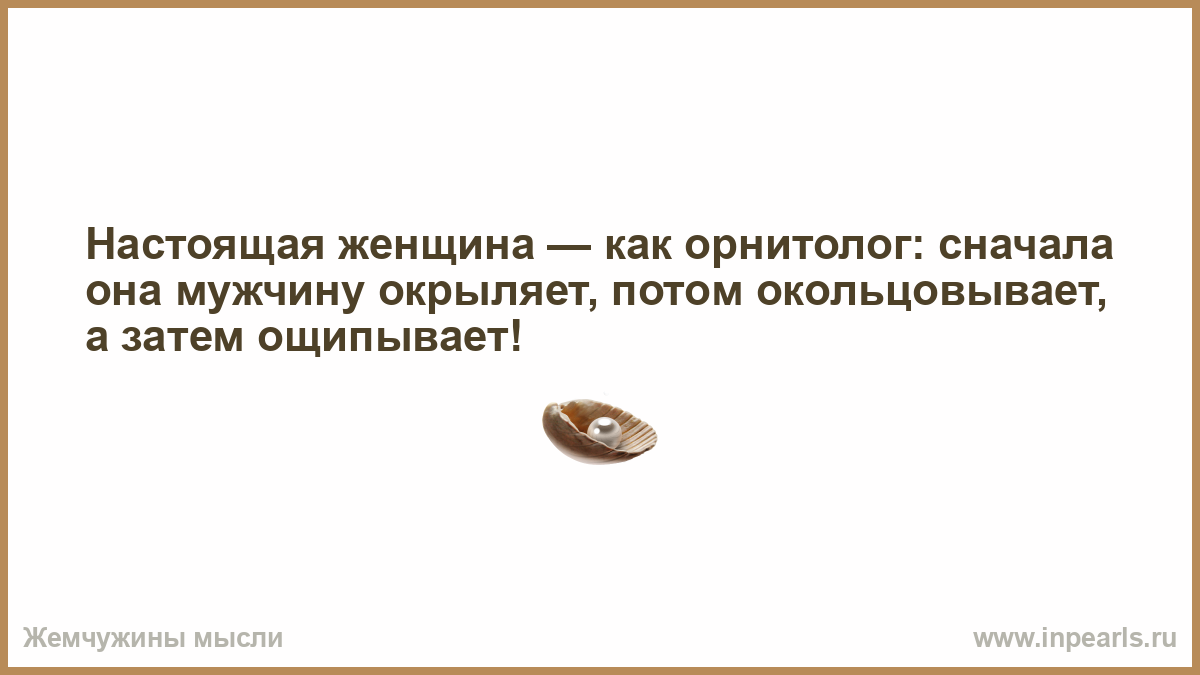 Настоящая женщина — как орнитолог: сначала она мужчину окрыляет, потом окольцовывает, а затем ощипывает!