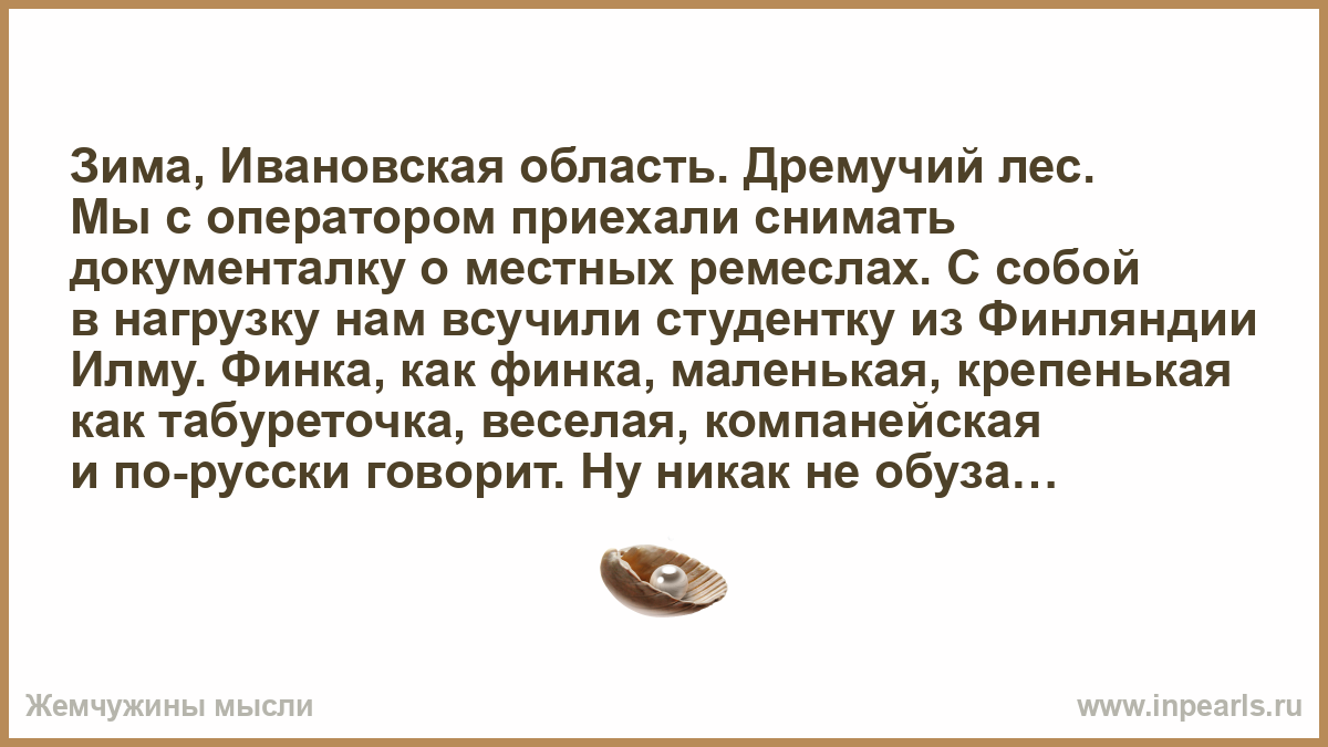 Зима, Ивановская область. Дремучий лес. Мы с оператором приехали снимать документалку о местных ремеслах. С собой в нагрузку нам всучили студентку из Финляндии Илму. Финка, как финка, маленькая, крепенькая как табуреточка, веселая, компанейская и по-русски говорит. Ну никак не обуза.