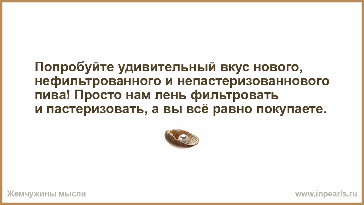 Попробуйте удивительный вкус нового, нефильтрованного и непастеризованнового пива! Просто нам лень фильтровать и пастеризовать, а вы всё равно покупаете.