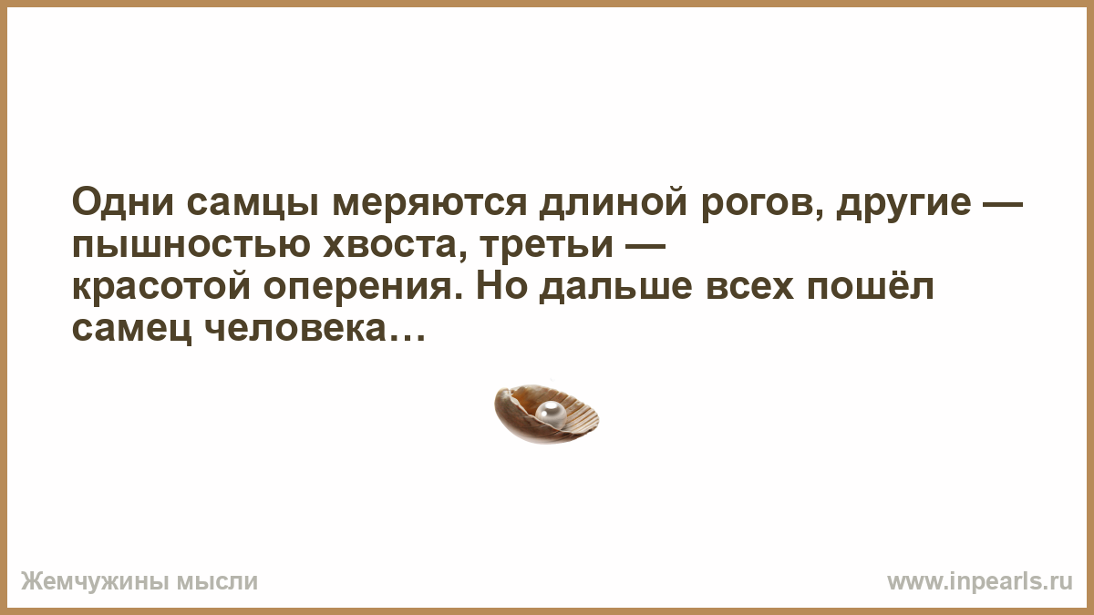 Одни самцы меряются длиной рогов, другие — пышностью хвоста, третьи — красотой оперения. Но дальше всех пошёл самец человека…