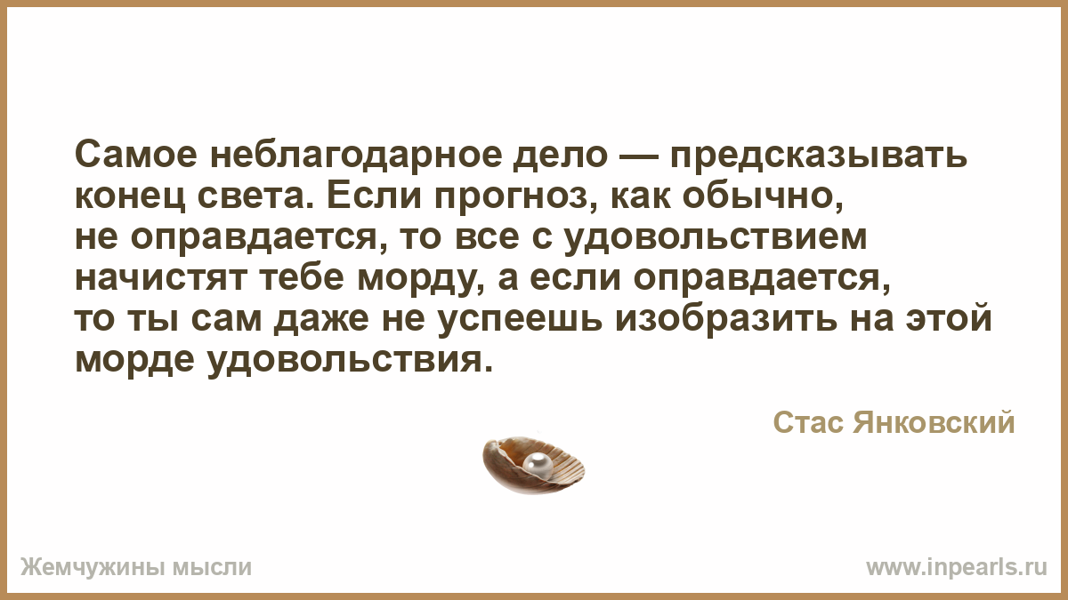 Самое неблагодарное дело — предсказывать конец света. Если прогноз, как обычно, не оправдается, то все с удовольствием начистят тебе морду, а если оправдается, то ты сам даже не успеешь изобразить на этой морде удовольствия.