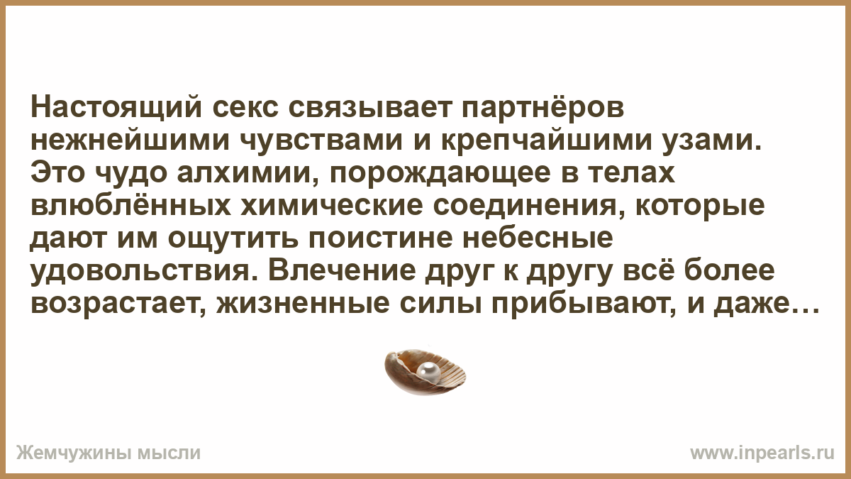 Настоящий секс связывает партнёров нежнейшими чувствами и крепчайшими узами. Это чудо алхимии, порождающее в телах влюблённых химические соединения, которые дают им ощутить поистине небесные удовольствия. Влечение друг к другу всё более возрастает, жизненные силы прибывают, и даже качественно улучшается здоровье. Секс не только переносит нас в юность, с её яркими красками жизни, но и дарует чувство прекрасного. Привлекательными для партнёров становятся не только они сами друг для друга, но и весь мир вокруг. Секс — Божий дар для тех, кто старается сделать любовь основанием всей своей жизни.