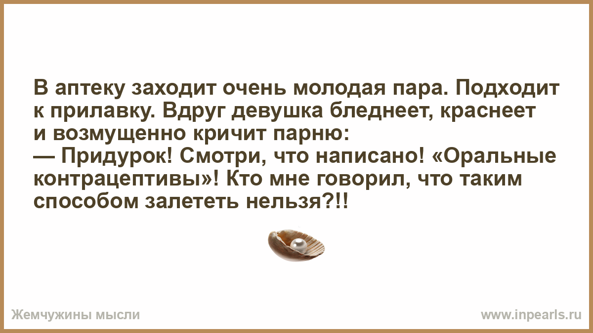 В аптеку заходит очень молодая пара. Подходит к прилавку. Вдруг девушка бледнеет, краснеет и возмущенно кричит парню: — Придурок! Смотри, что написано! «Оральные контрацептивы»! Кто мне говорил, что таким способом залететь нельзя?!!