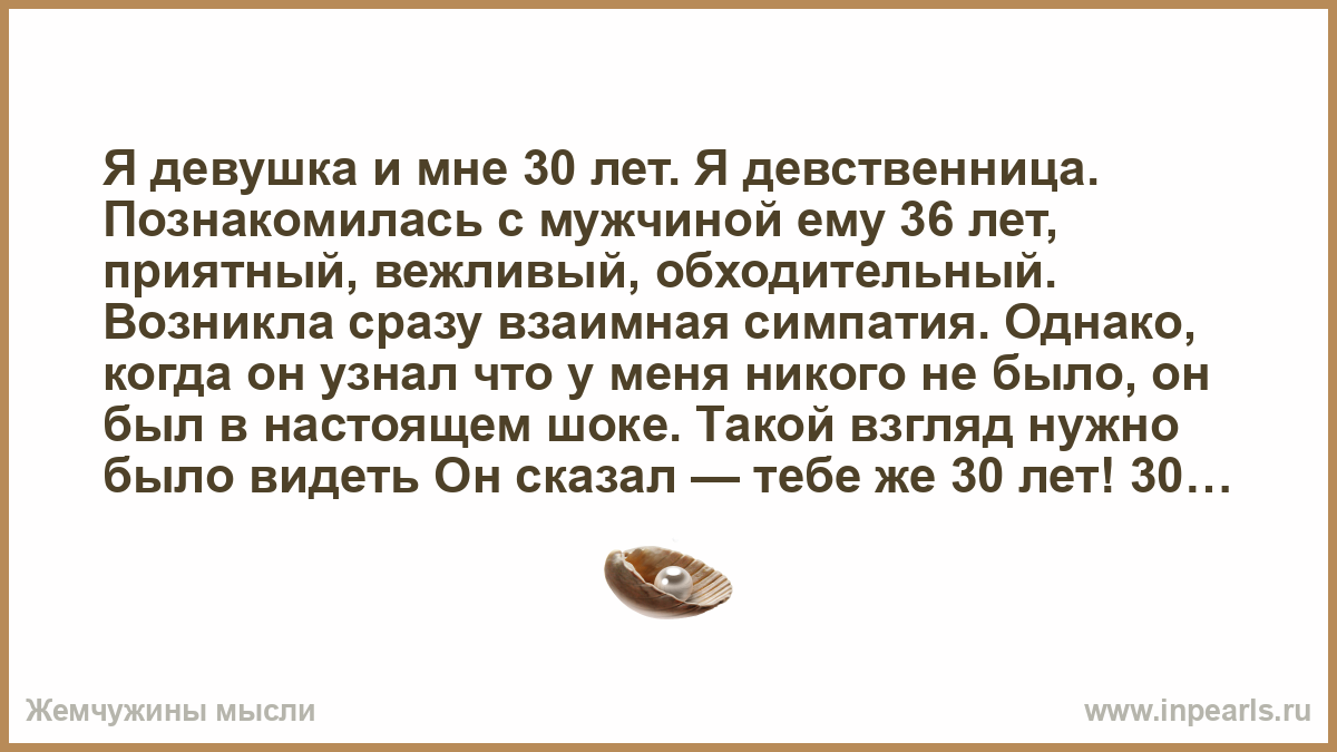 Возникла сразу взаимная симпатия. Однако, когда он узнал что у меня никого не было, он был в настоящем шоке. Такой взгляд нужно было видеть Он сказал — тебе же 30 лет! 30 лет!!! Прям повторил так акцент на этом сделал. Мне стало очень неприятно. Я сказала ему что это лучше чем *** и 33 мужика в прошлом… На что он просто стал ржать. Меня это так унизило. В общем неделю уже с ним не общаюсь хотя он очень часто звонит. Я не ожидала такой реакции. На вид я очень симпатичная девушка и стройная. Выгляжу хорошо молодо. Я не понимаю почему он меня за это высмеял… В чем дело???