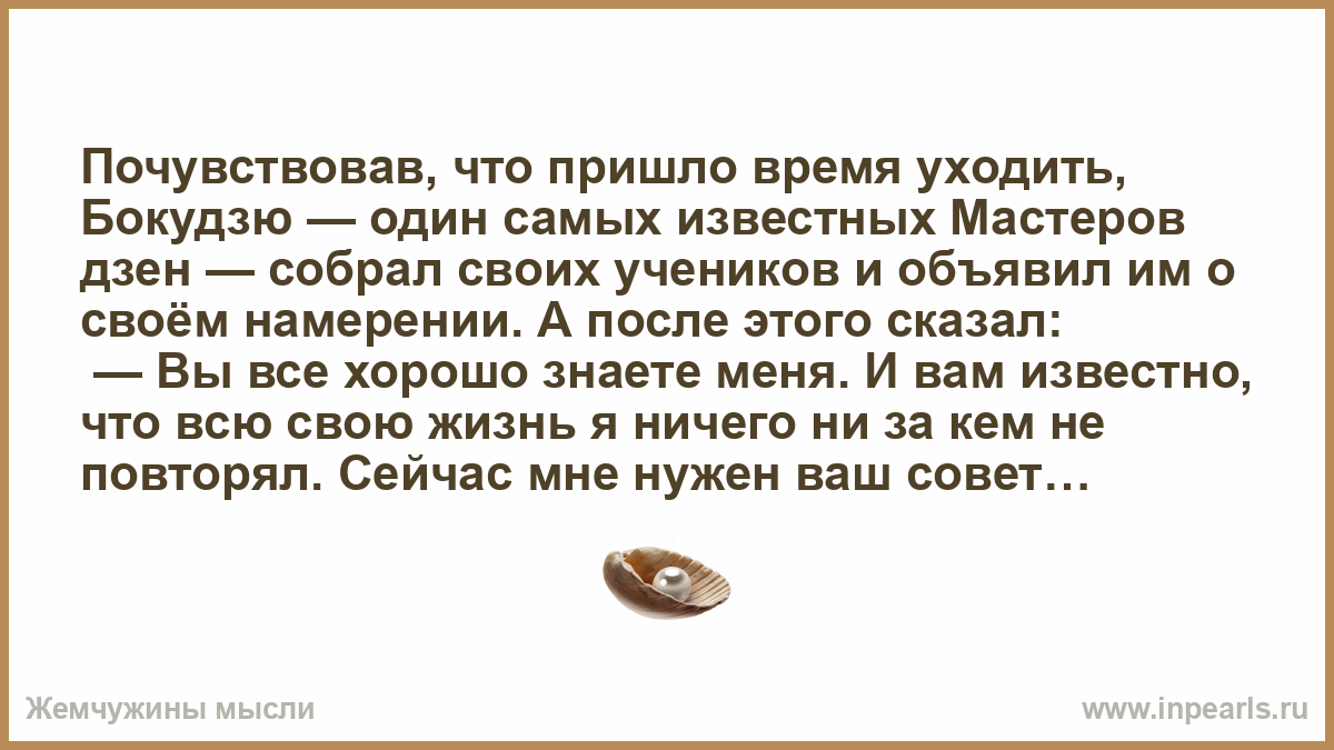 Почувствовав, что пришло время уходить, Бокудзю — один самых известных Мастеров дзен — собрал своих учеников и объявил им о своём намерении. А после этого сказал: