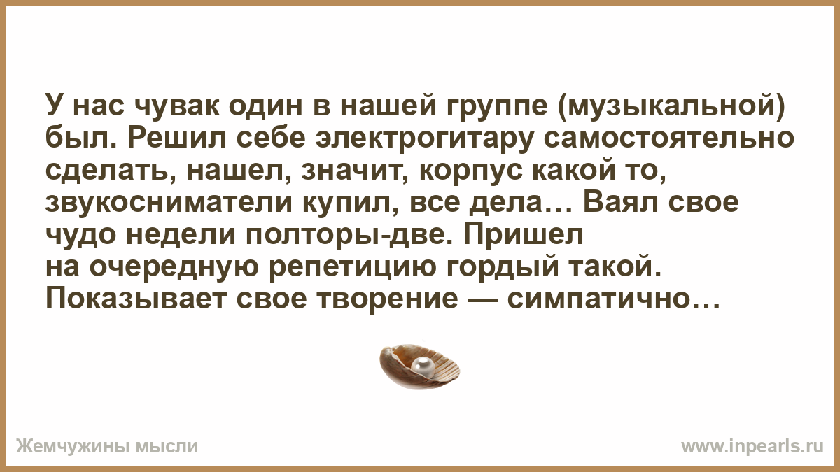 У нас чувак один в нашей группе (музыкальной) был. Решил себе электрогитару самостоятельно сделать, нашел, значит, корпус какой то, звукосниматели купил, все дела… Ваял свое чудо недели полторы-две. Пришел на очередную репетицию гордый такой. Показывает свое творение — симпатично получилось… Подключает гитарку к комбику, тот в пульт, громкость на максимум, а из колонок раздается: «Вы слушаете радио Маяк»