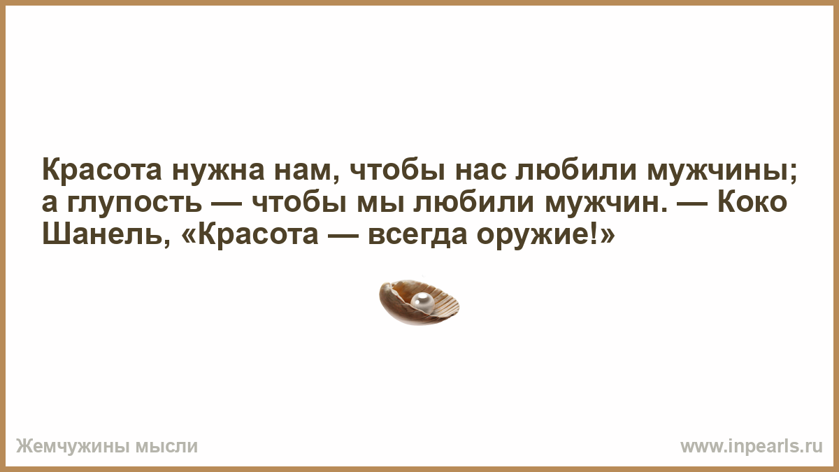 Красота нужна нам, чтобы нас любили мужчины; а глупость — чтобы мы любили мужчин. — Коко Шанель, «Красота — всегда оружие!»