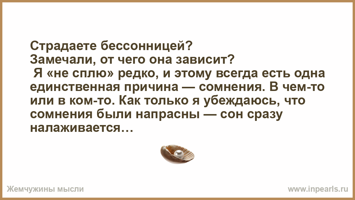 Я «не сплю» редко, и этому всегда есть одна единственная причина — сомнения. В чем-то или в ком-то. Как только я убеждаюсь, что сомнения были напрасны — сон сразу налаживается!