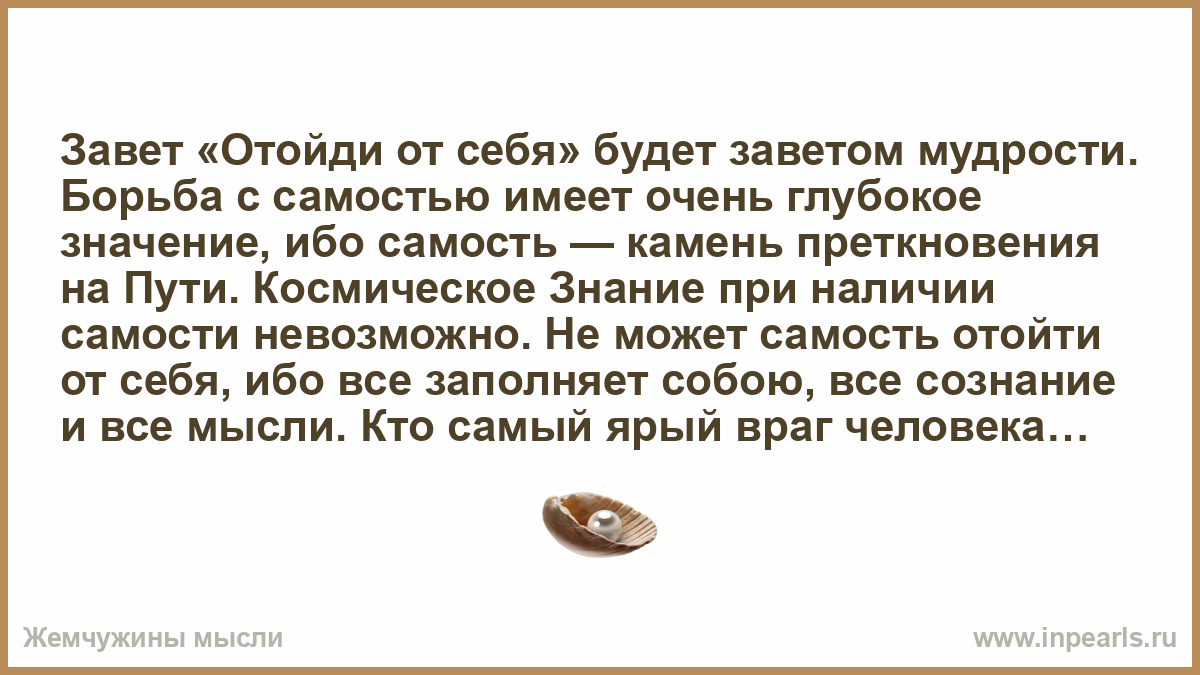 Завет «Отойди от себя» будет заветом мудрости. Борьба с самостью имеет очень глубокое значение, ибо самость — камень преткновения на Пути. Космическое Знание при наличии самости невозможно. Не может самость отойти от себя, ибо все заполняет собою, все сознание и все мысли. Кто самый ярый враг человека? Самость его.