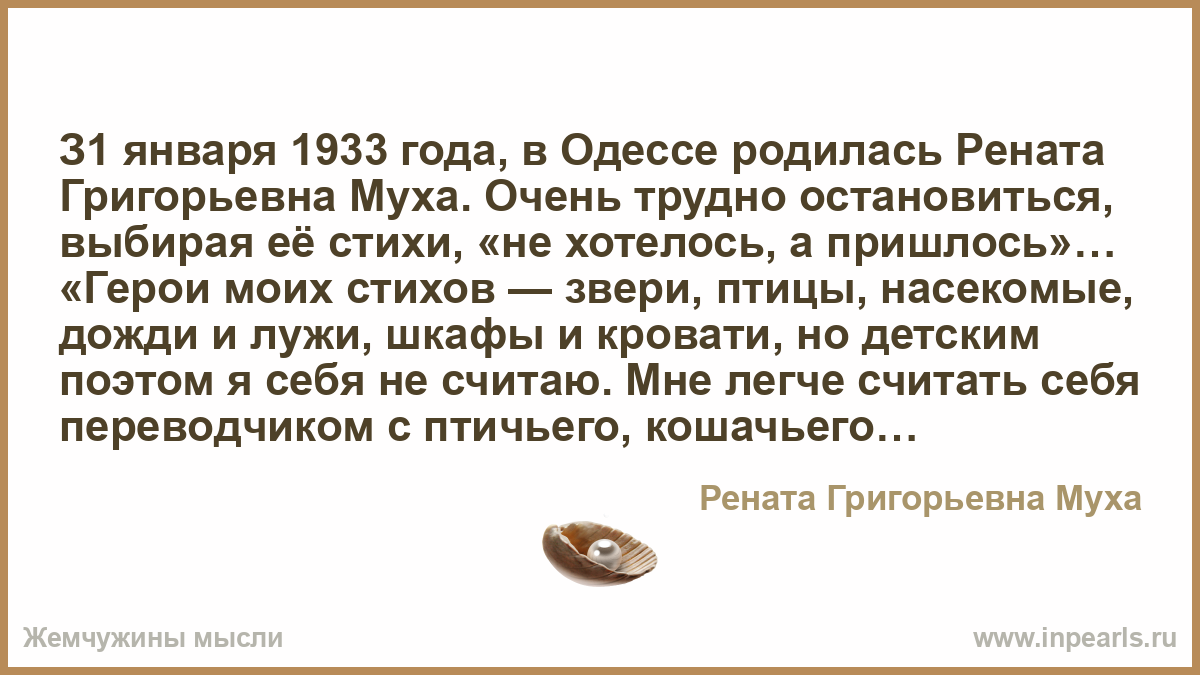 З1 января 1933 года, в Одессе родилась Рената Григорьевна Муха. Очень трудно остановиться, выбирая её стихи, «не хотелось, а пришлось»…