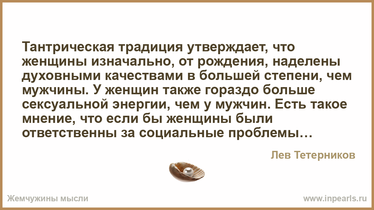 Тантрическая традиция утверждает, что женщины изначально, от рождения, наделены духовными качествами в большей степени, чем мужчины. У женщин также гораздо больше сексуальной энергии, чем у мужчин. Есть такое мнение, что если бы женщины были ответственны за социальные проблемы в современном обществе, то все сферы жизни пропитались бы большей красотой, состраданием, любовью и пониманием.