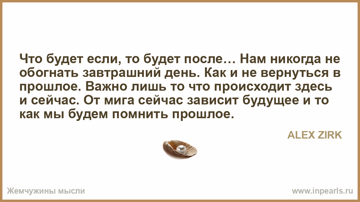 Что будет если, то будет после… Нам никогда не обогнать завтрашний день. Как и не вернуться в прошлое. Важно лишь то что происходит здесь и сейчас. От мига сейчас зависит будущее и то как мы будем помнить прошлое.