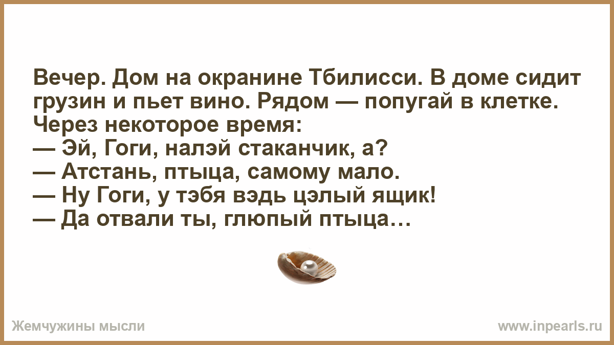 Утро. Грузин просыпается, видит — по клетке ходит взад—вперед злой, взъерошенный попугай и о чем—то напряженно думает. Грузин: