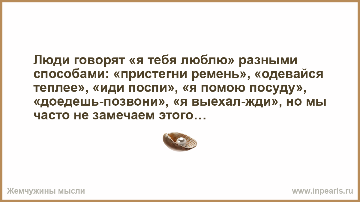Люди говорят «я тебя люблю» разными способами: «пристегни ремень», «одевайся теплее», «иди поспи», «я помою посуду», «доедешь-позвони», «я выехал-жди», но мы часто не замечаем этого…