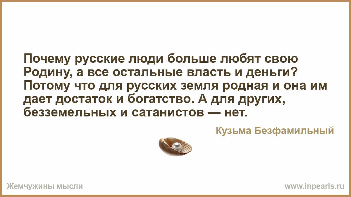 Почему русские люди больше любят свою Родину, а все остальные власть и деньги? Потому что для русских земля родная и она им дает достаток и богатство. А для других, безземельных и сатанистов — нет.