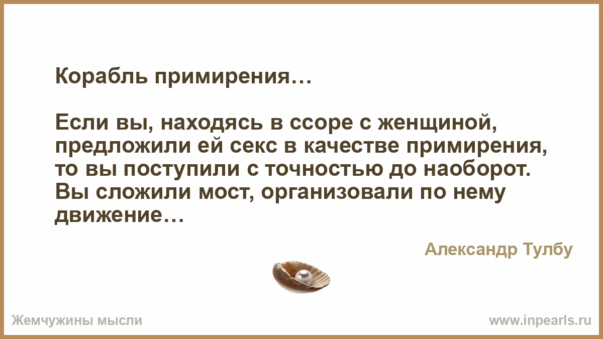 Если находясь в ссоре с женщиной Вы предложили ей секс в качестве примирения, то, значит, поступили с точностью до наоборот. Вы сцепили мост, организовали по нему движение, но корабль примирения, движущийся курсом меж вас, не прошел по габаритам, и разбился об этот мост. Грустно, и еще как. Лучше было мост развести, пустить корабль примирения, и как он пройдет, возможно мост сцепить, и организовать по нему движение.