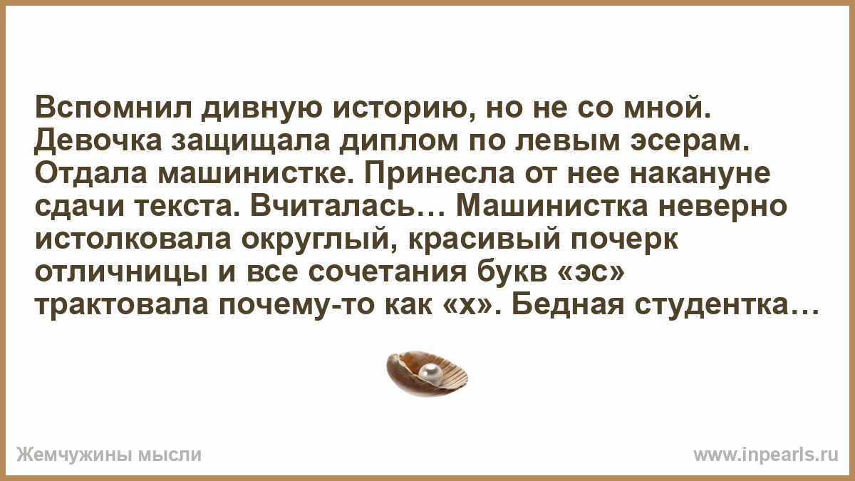 Вспомнил дивную историю, но не со мной. Девочка защищала диплом по левым эсерам. Отдала машинистке. Принесла от нее накануне сдачи текста. Вчиталась… Машинистка неверно истолковала округлый, красивый почерк отличницы и все сочетания букв «эс» трактовала почему-то как «х». Бедная студентка всю ночь то рыдала, то ржала, вырезала маникюрными ножницами специально распечатанные где-то (еще ж машинку найти надо было в общежитии) «эс» и заклеивала в дипломе по «левым херам» буквы «х».