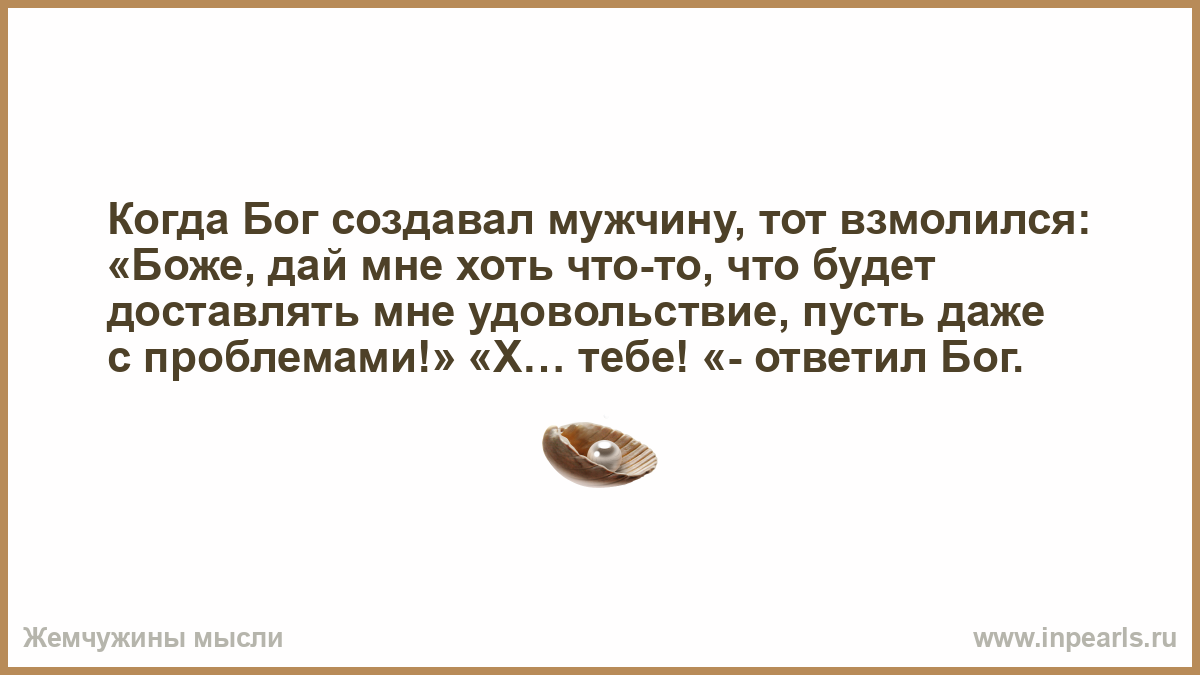 Когда Бог создавал мужчину, тот взмолился: «Боже, дай мне хоть что-то, что будет доставлять мне удовольствие, пусть даже с проблемами!» «Х… тебе! «- ответил Бог.